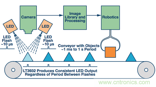 幸運的是,LT3932高速LED驅動器可為高達2 A的LED串提供機器視覺相機閃光燈,關斷時間可以長達1秒、1小時、1天或更長時間。LT3932的特殊相機閃光燈功能允許其保持輸出電容和控制環(huán)路充電狀態(tài),哪怕是在長關斷時間內。對輸出和控制環(huán)路電容的狀態(tài)進行采樣后,LT3932繼續(xù)在長關斷期間對這些元件進行涓流充電,以補償通常都會有的漏電流,而這是其他LED驅動器未予考慮的。