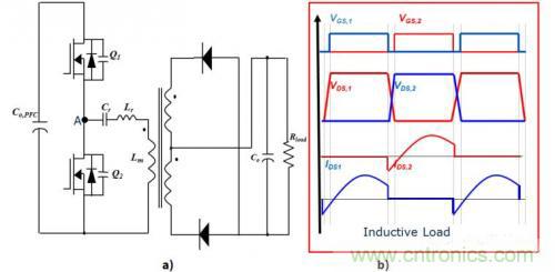圖a)是典型的LLC串聯(lián)諧振電路。圖b)是感性負(fù)載下MOSFET的工作波形。由于感性負(fù)載下,電流相位上會超前電壓,因此保證了MOSFET運行的ZVS。要保證MOSFET運行在感性區(qū),諧振電感上的諧振電流必須足夠大,以確保MOSFET源漏間等效的寄生電容上存儲的電荷可以在死區(qū)時間內(nèi)被完全釋放干凈。