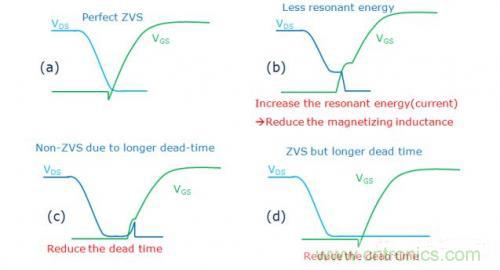 因此選擇合適的MOSFET(足夠小的等效寄生電容),對于ZVS的實現(xiàn)至關(guān)重要,尤其是當(dāng)Vds接近于0的時候,等效輸出電容要足夠小,這樣還可以進(jìn)一步降低死區(qū)時間并提高LLC的工作效率。