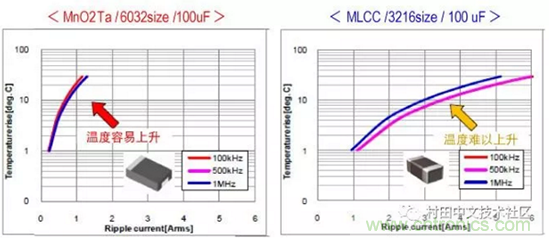 由上圖可知,大于100kHz頻率時(shí),與Ta電容器(MnO2) 100uF相比,盡管MLCC 22uF的靜電容量小,但其阻抗更小。這是因?yàn)镸LCC的ESR、ESL更小。