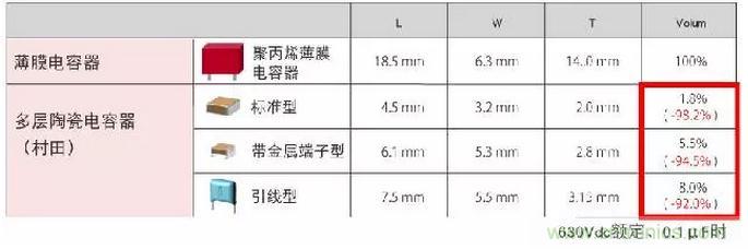 多層陶瓷電容器和薄膜電容器同一電壓、同一容量的比較表??芍鄬犹沾呻娙萜鞣浅P⌒突?。