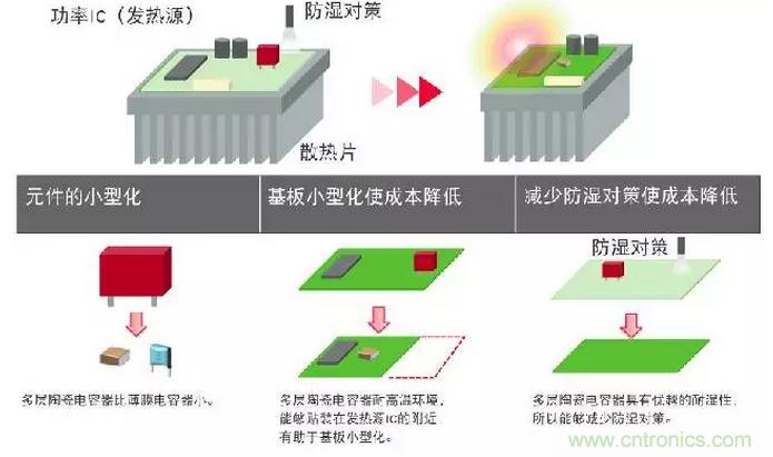 選擇多層陶瓷電容器,元件的小型化、元件貼裝位置自由度的提高使基板具有小型化和由于優(yōu)越的耐濕性,而減少防濕對策的優(yōu)勢。