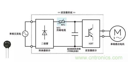 逆變器系統(tǒng)包括轉(zhuǎn)換器部分、逆變器部分和安裝在轉(zhuǎn)換器部分之后的直流鏈路電容器(平滑電容器)。啟動時,裝置充電,峰值比穩(wěn)定電流大幾倍的勵磁涌流充滿直流鏈路電容器。這種勵磁涌流可能對直流電容器的使用壽命產(chǎn)生有害影響或破壞半導(dǎo)體器件。為了防止勵磁涌流,所以連接NTC熱敏電阻(電源熱敏電阻)。