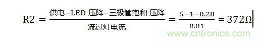 公式解析:供電5V減去三極管飽和壓降0.28V再減去LED燈發(fā)光時壓降約為1V,得出值再除以流過LED燈的電流10mA,則為所需電阻值。當(dāng)然了電阻取值大點小點只會微弱影響通過LED燈電流,發(fā)光度不會有明顯變化,我們?nèi)?60的電阻。三極管飽和壓降差異不是那么大,基本在0.2~0.5V之間,0.3V居多。