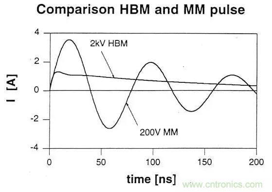 2、機器放電模式(MM):當(dāng)然就是機器(如robot)移動產(chǎn)生的靜電觸碰芯片時由pin腳釋放,次標(biāo)準(zhǔn)為EIAJ-IC-121 method 20(或者標(biāo)準(zhǔn)EIA/JESD22-A115-A),等效機器電阻為0 (因為金屬),電容依舊為100pF。由于機器是金屬且電阻為0,所以放電時間很短,幾乎是ms或者us之間。但是更重要的問題是,由于等效電阻為0,所以電流很大,所以即使是200V的MM放電也比2kV的HBM放電的危害大。而且機器本身由于有很多導(dǎo)線互相會產(chǎn)生耦合作用,所以電流會隨時間變化而干擾變化。