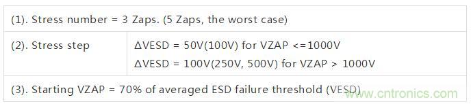 ESD的測試方法類似FAB里面的GOI測試,指定pin之后先給他一個ESD電壓,持續(xù)一段時間后,然后再回來測試電性看看是否損壞,沒問題再去加一個step的ESD電壓再持續(xù)一段時間,再測電性,如此反復(fù)直至擊穿,此時的擊穿電壓為ESD擊穿的臨界電壓(ESD failure threshold Voltage)。通常我們都是給電路打三次電壓(3 zaps),為了降低測試周期,通常起始電壓用標(biāo)準(zhǔn)電壓的70% ESD threshold,每個step可以根據(jù)需要自己調(diào)整50V或者100V。
