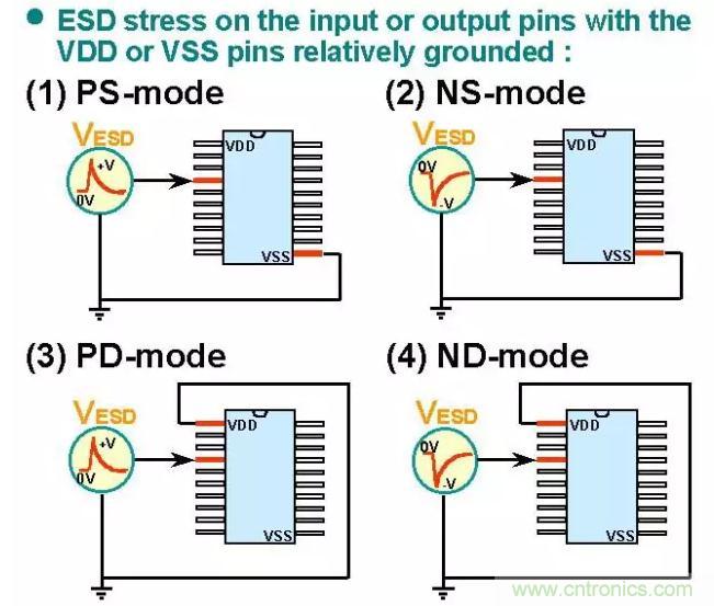 1. I/O pins:就是分別對input-pin和output-pin做ESD測試,而且電荷有正負之分,所以有四種組合:input+正電荷、input+負電荷、output+正電荷、output+負電荷。測試input時候,則output和其他pin全部浮接(floating),反之亦然。