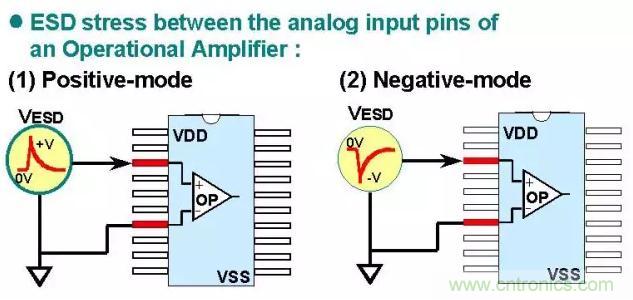 4、Analog-pin放電測試:因為模擬電路很多差分比對(Differential Pair)或者運算放大器(OP AMP)都是有兩個輸入端的,防止一個損壞導(dǎo)致差分比對或運算失效,所以需要單獨做ESD測試,當(dāng)然就是只針對這兩個pin,其他pin全部浮接(floating)。
