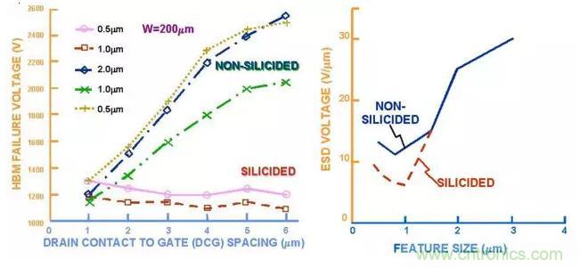 3) SAB (SAlicide Block):一般我們?yōu)榱私档蚆OS的互連電容,我們會使用silicide/SAlicide制程,但是這樣器件如果工作在輸出端,我們的器件負載電阻變低,外界ESD電壓將會全部加載在LDD和Gate結(jié)構(gòu)之間很容易擊穿損傷,所以在輸出級的MOS的Silicide/Salicide我們通常會用SAB(SAlicide Block)光罩擋住RPO,不要形成silicide,增加一個photo layer成本增加,但是ESD電壓可以從1kV提高到4kV。