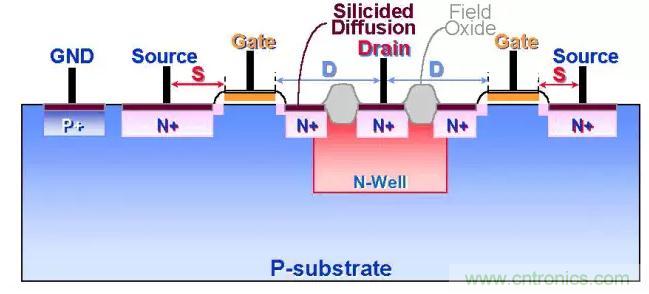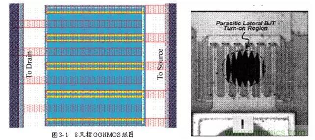 2、設(shè)計上的ESD:這就完全靠設(shè)計者的功夫了,有些公司在設(shè)計規(guī)則就已經(jīng)提供給客戶solution了,客戶只要照著畫就行了,有些沒有的則只能靠客戶自己的designer了,很多設(shè)計規(guī)則都是寫著這個只是guideline/reference,不是guarantee的。一般都是把Gate/Source/Bulk短接在一起,把Drain結(jié)在I/O端承受ESD的浪涌(surge)電壓,NMOS稱之為GGNMOS (Gate-Grounded NMOS),PMOS稱之為GDPMOS (Gate-to-Drain PMOS)。