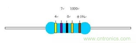 從左向右數(shù),第一道色環(huán)表示阻值的最大一位數(shù)字;第二道色環(huán)表示阻值的第二位數(shù)字;第三道色環(huán)表示阻值倍乘的數(shù);第四道色環(huán)表示阻值允許的偏差(精度)。