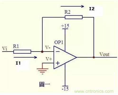 圖一運(yùn)放的同向端接地=0V,反向端和同向端虛短,所以也是0V,反向輸入端輸入電阻很高,虛斷,幾乎沒有電流注入和流出,那么R1和R2相當(dāng)于是串聯(lián)的,流過一個串聯(lián)電路中的每一只組件的電流是相同的,即流過R1的電流和流過R2的電流是相同的。 流過R1的電流I1 = (Vi - V-)/R1 ……a 流過R2的電流I2 = (V- - Vout)/R2 ……b V- = V+ = 0 ……c I1 = I2 ……d 求解上面的初中代數(shù)方程得Vout = (-R2/R1)*Vi 這就是傳說中的反向放大器的輸入輸出關(guān)系式了。