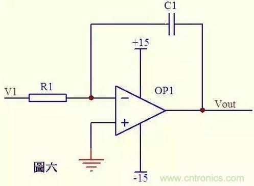 圖六電路中,由虛短知,反向輸入端的電壓與同向端相等,由虛斷知,通過R1的電流與通過C1的電流相等。 通過R1的電流 i=V1/R1 通過C1的電流i=C*dUc/dt=-C*dVout/dt 所以 Vout=((-1/(R1*C1))∫V1dt 輸出電壓與輸入電壓對時(shí)間的積分成正比,這就是傳說中的積分電路了。 若V1為恒定電壓U,則上式變換為Vout = -U*t/(R1*C1) t 是時(shí)間,則Vout輸出電壓是一條從0至負(fù)電源電壓按時(shí)間變化的直線。