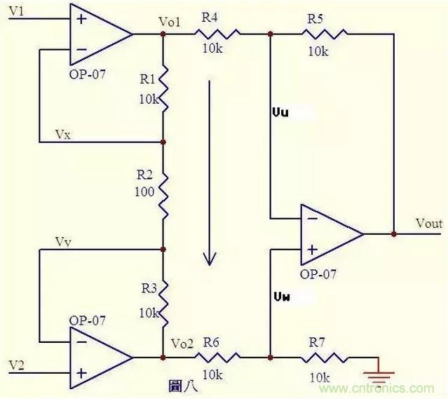 圖八.由虛短知 Vx = V1 ……a Vy = V2 ……b 由虛斷知,運(yùn)放輸入端沒有電流流過,則R1、R2、R3可視為串聯(lián),通過每一個電阻的電流是相同的, 電流I=(Vx-Vy)/R2 ……c 則: Vo1-Vo2=I*(R1+R2+R3) = (Vx-Vy)(R1+R2+R3)/R2 ……d 由虛斷知,流過R6與流過R7的電流相等,若R6=R7, 則Vw = Vo2/2 ……e 同理若R4=R5,則Vout – Vu = Vu – Vo1,故Vu = (Vout+Vo1)/2 ……f 由虛短知,Vu = Vw ……g 由efg得 Vout = Vo2 – Vo1 ……h 由dh得 Vout = (Vy –Vx)(R1+R2+R3)/R2 上式中(R1+R2+R3)/R2是定值,此值確定了差值(Vy –Vx)的放大倍數(shù)。 這個電路就是傳說中的差分放大電路了。