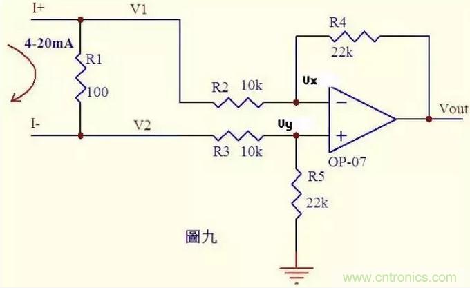 分析一個大家接觸得較多的電路。很多控制器接受來自各種檢測儀表的0~20mA或4~20mA電流,電路將此電流轉(zhuǎn)換成電壓后再送ADC轉(zhuǎn)換成數(shù)字信號,圖九就是這樣一個典型電路。如圖4~20mA電流流過采樣100Ω電阻R1,在R1上會產(chǎn)生0.4~2V的電壓差。由虛斷知,運(yùn)放輸入端沒有電流流過,則流過R3和R5的電流相等,流過R2和R4的電流相等。 故: (V2-Vy)/R3 = Vy/R5 ……a (V1-Vx)/R2 = (Vx-Vout)/R4 ……b 由虛短知: Vx = Vy ……c 電流從0~20mA變化,則V1 = V2 + (0.4~2) ……d 由cd式代入b式得(V2 + (0.4~2)-Vy)/R2 = (Vy-Vout)/R4 ……e 如果R3=R2,R4=R5,則由e-a得Vout = -(0.4~2)R4/R2 ……f 圖九中R4/R2=22k/10k=2.2,則f式Vout = -(0.88~4.4)V,即是說,將4~20mA電流轉(zhuǎn)換成了-0.88 ~ -4.4V電壓,此電壓可以送ADC去處理。