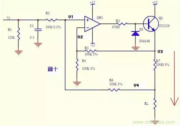 電流可以轉(zhuǎn)換成電壓,電壓也可以轉(zhuǎn)換成電流。圖十就是這樣一個電路。上圖的負(fù)反饋沒有通過電阻直接反饋,而是串聯(lián)了三極管Q1的發(fā)射結(jié),大家可不要以為是一個比較器就是了。只要是放大電路,虛短虛斷的規(guī)律仍然是符合的!