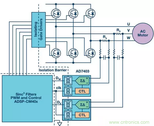 圖1所示為一個典型三相永磁電機驅(qū)動系統(tǒng),其利用檢測電阻測量繞組電流,并通過ADI公司的AD7403隔離式Σ-Δ調(diào)制器和sinc3濾波器提供反饋。AD7403使用單個二階調(diào)制器數(shù)字化電路來將檢測電阻的模擬信號轉(zhuǎn)換為隔離的一位數(shù)字脈沖流,其大小取決于滿量程輸入電壓范圍。然后,sinc3濾波器提取電流平均值,同時消除逆變器開關(guān)產(chǎn)生的噪聲。其存儲器可以存儲一個代表電流的16位整數(shù),與此同時,它可以將該數(shù)值與一個代表電流限值的基準(zhǔn)值相比較,如果發(fā)生過載,它就會通過單獨的引腳發(fā)送警報。利用更短的濾波器監(jiān)控過載,并將其與測量濾波器并聯(lián),可以縮短警報延遲時間。
