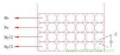 繞組電容就是指繞組之間產(chǎn)生的電容,比如說初級繞組Np與次級繞組Ns之間的電容。由于此電容存在于初次級繞組之間,對電路的EMI是非常不利的,因?yàn)槌跫壆a(chǎn)生的共模電流信號可以通過這個電容耦合到次級中去,這就造成了非常大的共模干擾,而共模干擾可能會引起電路噪音或者輸出不穩(wěn)定。