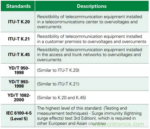 盡管客戶駐地設備(CPE)設計人員可采取三種基本的電路保護方案:氣體放電管(GDT)、瞬態(tài)電壓抑制(TVS)二極管陣列和保護型晶閘管,但他們所選擇的任何設備都必須使其設計最小程度地符合浪涌TIA-968B(以前稱為FCC第68部分)的要求。在美國,任何連接到公共交換電話網絡(PSTN)的通信設備均需具備此性能。其他國家也有類似要求,如表1所示。一些G.FAST供應商可能會傾向于在美國市場采用符合GR-1089-Core的安全設計。