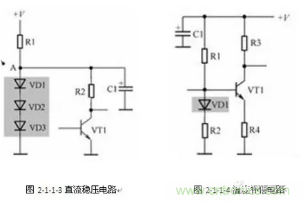 二極管簡易穩(wěn)壓電路中主要利用二極管的管壓降基本不變特性。二極管的管壓降特性:二極管導(dǎo)通后其管壓降基本不變,對硅二極管而言這一管壓降是0.6V左右,對鍺二極管而言是0.2V左右。上圖所示是由普通3只二極管構(gòu)成的簡易直流穩(wěn)壓電路。電路中的VD1、VD2和VD3是普通二極管,它們串聯(lián)起來后構(gòu)成一個簡易直流電壓穩(wěn)壓電路。圖2-1-1-3.