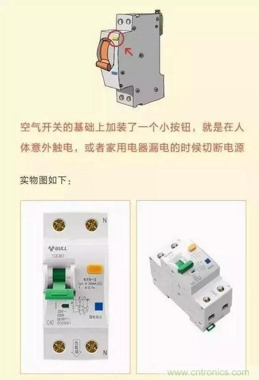 漏電斷路器是在空氣開關(guān)的基礎(chǔ)上添加的一個(gè)小按鈕,當(dāng)發(fā)生意外漏電的時(shí)候,會(huì)引發(fā)開關(guān)自動(dòng)切斷電源。
