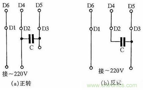 圖247為IDD5032型單相電容運(yùn)轉(zhuǎn)電動機(jī)接線方法。其功率為60W,電容選用耐壓500V、容量為4μF的產(chǎn)品。圖3(a)為正轉(zhuǎn)接線,圖3(b)為反轉(zhuǎn)接線。