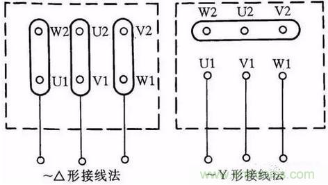 圖1:三相交流電動機(jī)Y形和△形接線方法