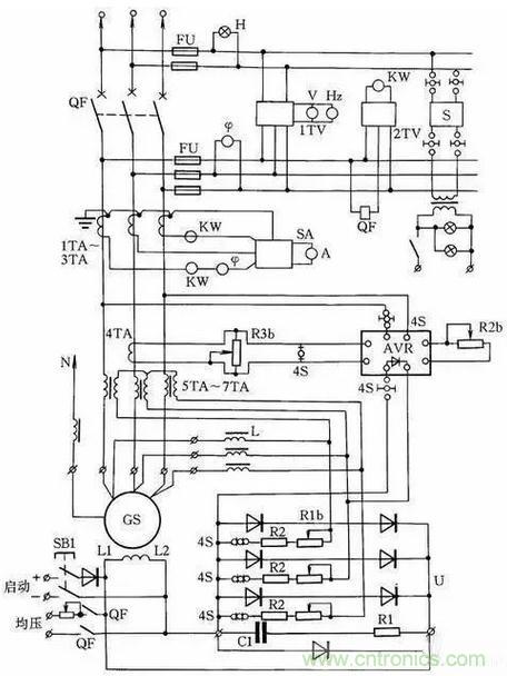 HF-4-81系列發(fā)電機(jī)控制線路如圖15所示,它與T2XV系列小型三相同步發(fā)電機(jī)配套。同步發(fā)電機(jī)的勵磁系統(tǒng)采用電復(fù)合相復(fù)勵調(diào)壓。發(fā)電機(jī)端電壓經(jīng)線性電抗器L移相,然后與發(fā)電機(jī)負(fù)荷電路中的電流互感器5TA~7TA二次電壓合成,經(jīng)三相橋式整流器整流后,供發(fā)電機(jī)GS勵磁自動調(diào)壓。