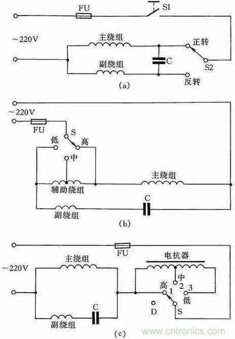 圖16(c)為帶電抗器調(diào)速的電容電動機(jī)接線線路。由于電抗器繞組(其在線路中起到降壓作用)的串入,調(diào)節(jié)電抗器繞組的串入量,即可改變轉(zhuǎn)速。這種方法目前廣泛應(yīng)用在家用電風(fēng)扇線路中。在啟動電動機(jī)時一般先撥到“1”擋上,即為高擋,這時電抗器不接入線路,使電動機(jī)在全壓下啟動,然后再撥“2”擋或任何擋來調(diào)節(jié)電動機(jī)轉(zhuǎn)速。