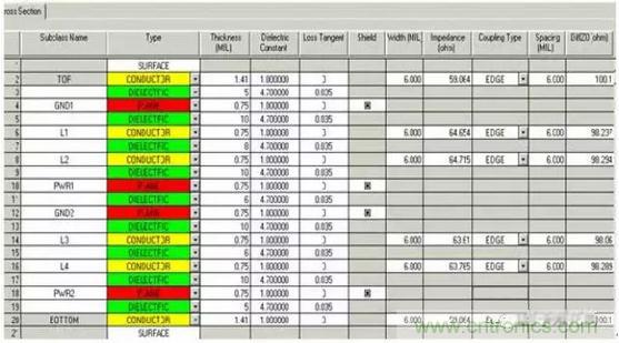 由上面的分析知道,PCB板的疊層設(shè)置和信號的耦合以及阻抗計算都有著密切的關(guān)系,所以在開始PCB設(shè)計之前必須進行疊層設(shè)計,然后進行信號的阻抗計算。在本設(shè)計中的疊層設(shè)計見下圖: