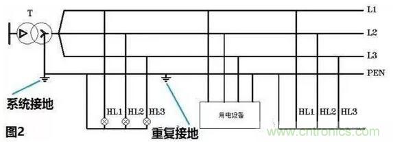 在這樣的供電系統(tǒng)中地線和零線合二為一稱之為PEN線,值得注意的是這種系統(tǒng)中的PEN線需要在配電網(wǎng)中重復(fù)接地形成一個(gè)接地網(wǎng),以保證PEN線的零電位。