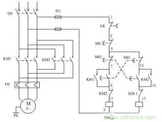 按鈕SB3的常開觸點與接觸器KM1線圈串聯(lián),而常閉觸點壓KM2線圈回路串聯(lián)。這樣當按下SB2時只能有接觸器KM2的線圈可以通電而KM1斷電,按下SB3時只能有接觸器KM1的線圈可以通電而KM2斷電,如果同時按下SB2和SB3則兩只接觸器線圈都不能通電。這樣就起到了互鎖的作用。