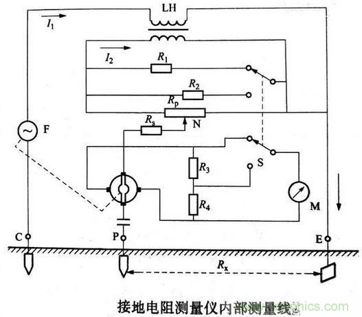 接地電阻測量儀由手搖發(fā)電機F、電流互感器LH、倍率開關S、調節(jié)電位器Rp及檢流計M等組成,全部機構裝在塑料殼內,外有皮殼便于攜帶,附件有輔助探棒、導線等,其內部測量線路如下圖所示。