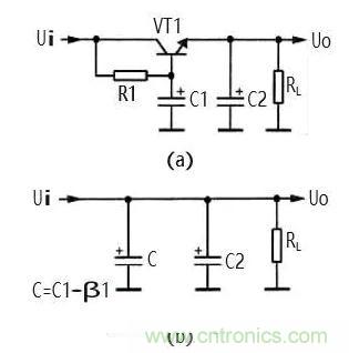 ①電路中的 VT1、 R1、 C1 組成電 子濾波器電路,這 一電路相當于一 只容量為 C1×β1 大小電容器,β1 為 VT1 的電流放 大倍數(shù),而晶體管 的電流放大倍數(shù) 比較大,所以等效 電容量很大,可見 電子濾波器的濾 波性能是很好的。等效電路如圖 6(b)所示。圖中 C 為 等效電容。