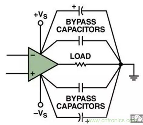 這種方法在大多數(shù)情況下都是最有效的,採(cǎi)用多個(gè)并聯(lián)電容器將運(yùn)算放大器的電源引腳直接接地。一般說來兩個(gè)并聯(lián)電容就足夠了,但是增加并聯(lián)電容器可能給某些電路帶來益處。