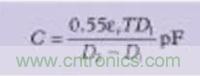 當(dāng)尋找有問題的寄生源時(shí),可能用得著幾個(gè)計(jì)算上述那些寄生電容尺寸的基本公式。(公式一)是計(jì)算平行極板電容器的公式,如(圖五)。