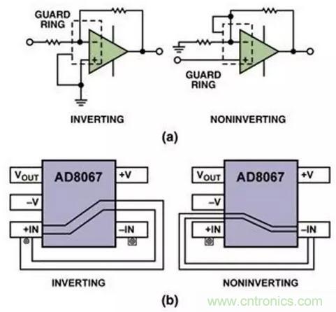 (公式七)保護(hù)環(huán),或者稱隔離環(huán),是運(yùn)算放大器常用的另一種遮罩方法,它用于防止寄生電流進(jìn)入敏感結(jié)點(diǎn)。其基本原理很簡(jiǎn)單,用一條保護(hù)導(dǎo)線將敏感結(jié)點(diǎn)完全包圍起來,導(dǎo)線保持或者迫使它保持(低阻抗)與敏感結(jié)點(diǎn)相同的電勢(shì),因此使吸收的寄生電流遠(yuǎn)離了敏感結(jié)點(diǎn)。(圖十五)(a)顯示了用于運(yùn)算放大器反相配置和同相配置中保護(hù)環(huán)的原理圖。圖十五(b)則顯示用于SOT-23-5封裝中兩種保護(hù)環(huán)的典型佈線方法。
