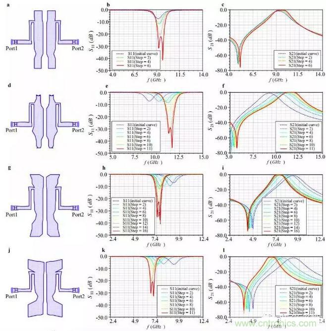 第二項(xiàng)任務(wù)和第三項(xiàng)任務(wù)的AI首先學(xué)會(huì)調(diào)整諧振器的長(zhǎng)度,以達(dá)到移動(dòng)中心頻率的目的,然后調(diào)整諧振器之間的耦合系數(shù),以減少通帶回波損耗,增加插入損耗,其設(shè)計(jì)過程如圖3(d-i)所示。
