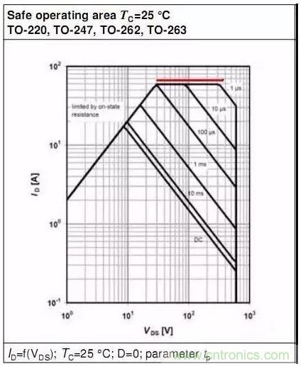 此圖中:當VDS=1V時,Y軸對應的ID為2A,Rds=VDS/ID=0.5R ==>Tj=150℃時,Rds(on)約為0.5R.當VDS=10V時,Y軸對應的ID為20A,Rds=VDS/ID=0.5R ==>Tj=150℃時,Rds(on)約為0.5R.所以,此部分曲線中,SOA表現(xiàn)為Tj_max時RDS(on)的限制.