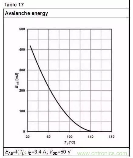 計算出來EAS后,對比datasheet上的EAS值,若在datasheet的范圍內(nèi),則可認為是安全的(當然前提是雪崩電流<IAR)同時,還得注意,EAS隨結(jié)溫的增加是減小的,如下圖:
