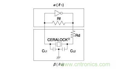 考畢茲電路采用反相放大器 (theta1=180°),還采用反饋電路中的“L”和“C”來進(jìn)行進(jìn)一步反轉(zhuǎn) (theta2=180°)。當(dāng)振蕩電路采用CERALOCK®時,其工作原理同上。為了在考畢茲振蕩電路中利用CERALOCK®,通常使用逆變器。