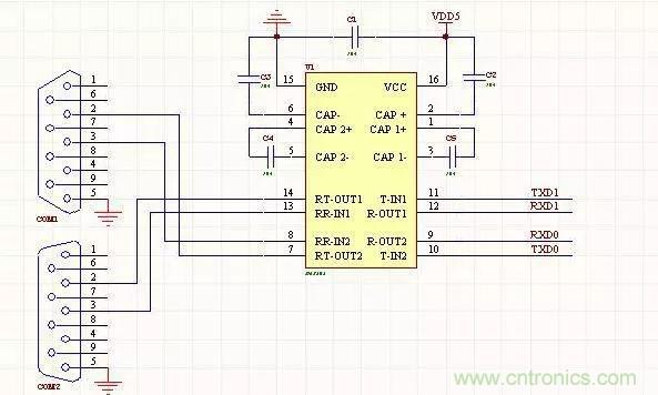 1、雙路232通信電路3線連接方式,對應(yīng)的是母頭,工作電壓5V,可以使用MAX202或MAX232.