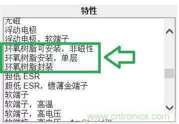 此外,有兩種選擇這些環(huán)氧樹(shù)脂安裝電容,或者過(guò)濾掉它們。若只選擇環(huán)氧樹(shù)脂安裝選項(xiàng),請(qǐng)?jiān)?quot;特性"選項(xiàng)中選擇環(huán)氧樹(shù)脂,如下圖所示: