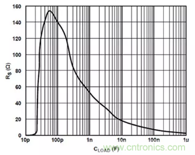 圖3:圖2中的電路在單位增益、±110V供電電壓及VOUT = 100Vp-p時(shí),最大峰值為2dB對應(yīng)的RS與CLOAD關(guān)系曲線圖。(圖片來源:Analog Devices)