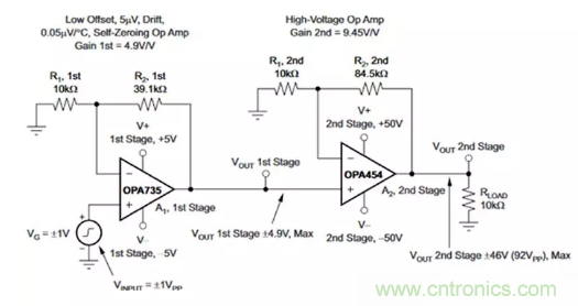 圖7:在OPA454的輸入路徑中加裝近零漂移運(yùn)算放大器OPA735,會(huì)生成一個(gè)輸入失調(diào)溫度漂移非常低的兩級高壓電路。(圖片來源:Texas Instruments)