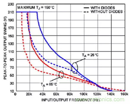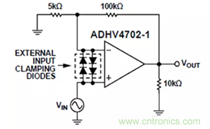 動(dòng)態(tài)SOA也是要關(guān)注的方面。ADHV4702-1采用了內(nèi)部壓擺率升壓電路來實(shí)現(xiàn)19兆赫 (MHz) 小信號帶寬和74伏/微秒 (µs) 的壓擺率,但這種升壓電路可能會(huì)消耗大電流,具體取決于信號。為此,使用ADHV4702-1加裝外部二極管可限制差分輸入電壓(圖9)。