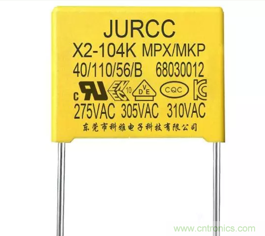 X電容是跨接在電力線兩線之間,即“L-N”之間,X電容器能夠抑制差模干擾,通常采取金屬化薄膜電容器,電容容量是uF級。X電容多數(shù)是方型,也就是類似于盒子的形狀,在它的表面一般都標(biāo)有安全認證標(biāo)志、耐壓字樣(一般有AC300V或AC275V)、依靠標(biāo)準等信息。X電容雖然是CBB電容的一種,但是并不是每一種CBB電容就能做X電容必須要達到安規(guī)標(biāo)準。
