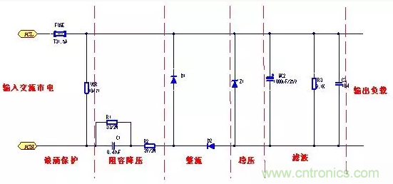 阻容降壓也是X電容經(jīng)常用到的,特別對于成本低廉成品,電容降壓的工作原理是利用電容在一定的交流信號頻率下產(chǎn)生的容抗來限制最大工作電流。同時在電容器上串聯(lián)一個阻性元件,則阻性元件兩端所得到的電壓和它所產(chǎn)生的功耗完全取決于這個阻性元件的特性。因此,電容降壓實際上是利用容抗限流,而電容器實際上起到一個限制電流和動態(tài)分配電容器和負載兩端電壓的角色。如下圖