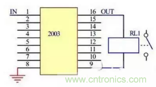當(dāng)2003輸入端為高電平時(shí),對(duì)應(yīng)的輸出口輸出低電平,繼電器線圈兩端通電,繼電器觸點(diǎn)吸合;當(dāng)2003輸入端為低電平時(shí),對(duì)應(yīng)的輸出口呈高阻態(tài),繼電器線圈兩端斷電,繼電器觸點(diǎn)斷開。
