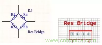 (a)電阻橋的原理圖符號(hào)及對(duì)應(yīng)的元器件封裝
